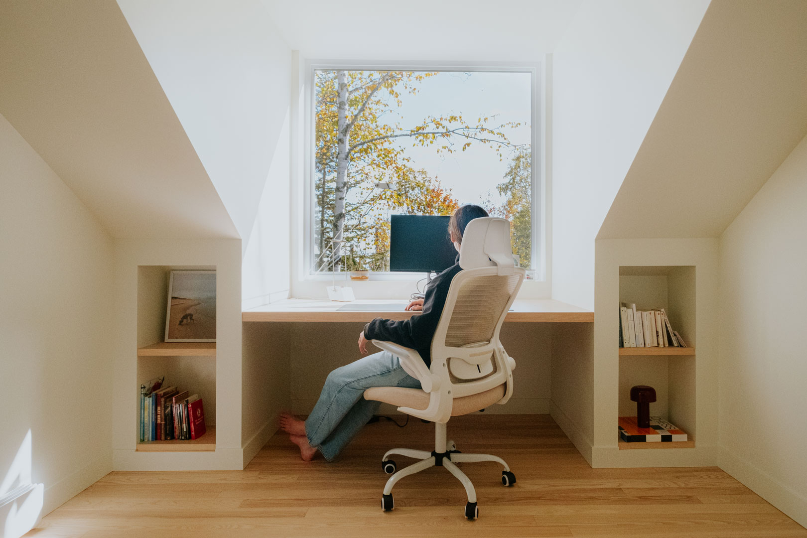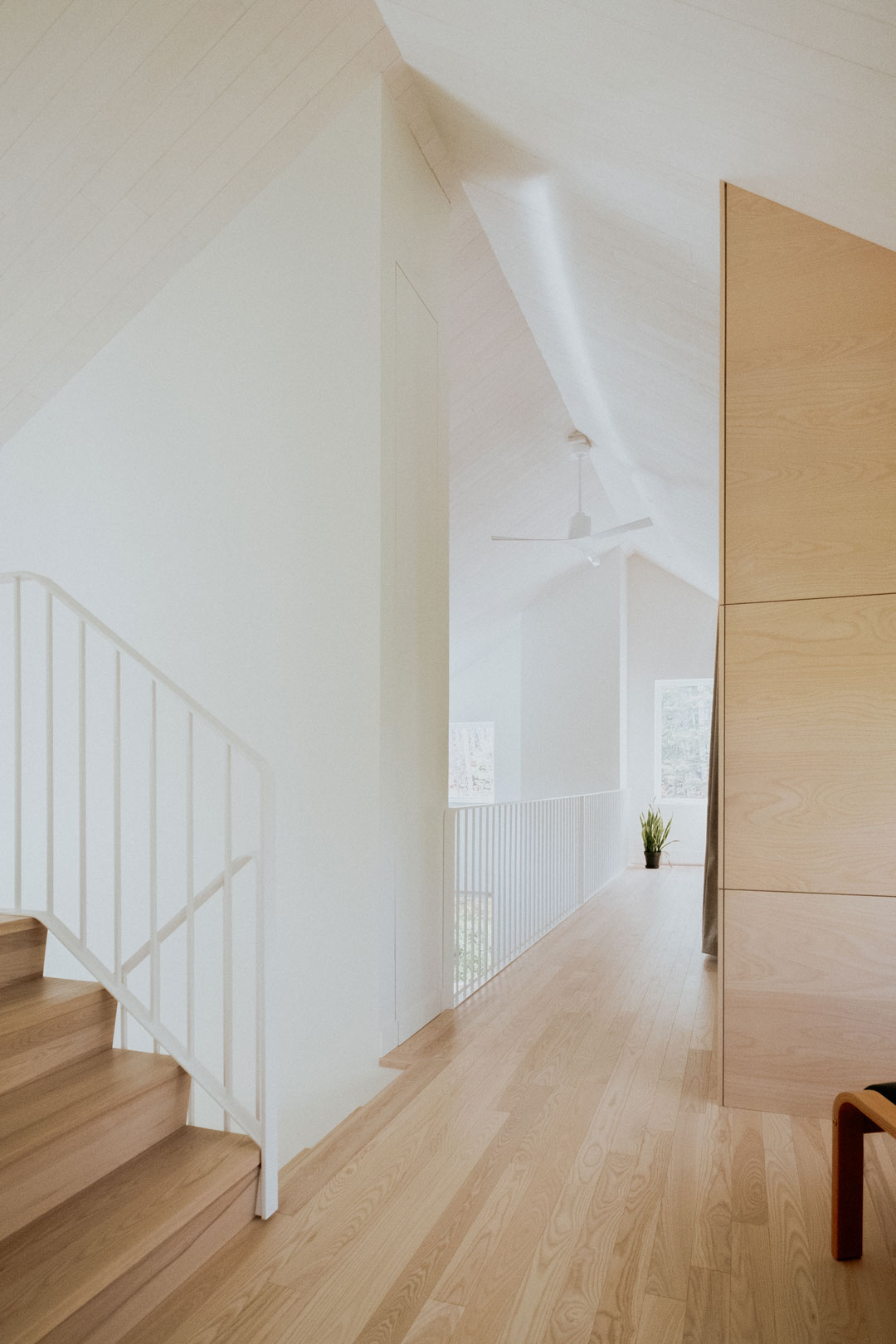 Érigée sur le flanc de la montagne, la demeure s'élève avec une élégance discrète et une toiture asymétrique, offrant un pignon désaxé, voire festif. Depuis sa lucarne, une vue époustouflante vers le majestueux Fleuve Saint-Laurent est perceptible. Inspirée par les typologies historiques de la région, sa silhouette évoque le charme intemporel des sheds d'antan, tandis que sa matérialité douce et naturelle lui confère une allure à la fois sobre et raffinée dans le souci du détail. La galerie déambulatoire, tel un pont entre deux espaces, efface les frontières entre l'intérieur et l'extérieur, invitant ses occupants à savourer la beauté de la nature environnante en toute saison. Que ce soit sous le soleil éclatant d'été ou la neige scintillante de l'hiver, Le Pignon Festif offre un refuge chaleureux où il fait bon se retrouver.